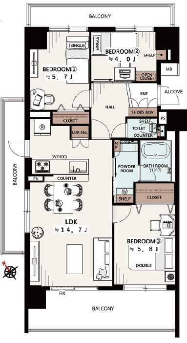 | バルコニー面積 | 21.42m² 南向き | ||